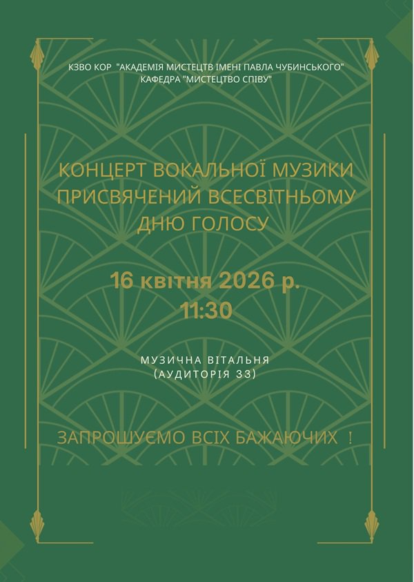 16 квітня 2026 року до Всесвітнього Дня голосу студенти спеціалізації "Мистецтво співу" підготували концерт вокальної музики. В програмі концерту прозвучали твори світової і вітчизняної класики, авторські та українські народні пісні. Ведуча концерту, завідувачка кафедри "Мистецтво співу", заслужена працівниця культури України І. М. Бойко розповіла про засновників, мету та історію цього свята.
