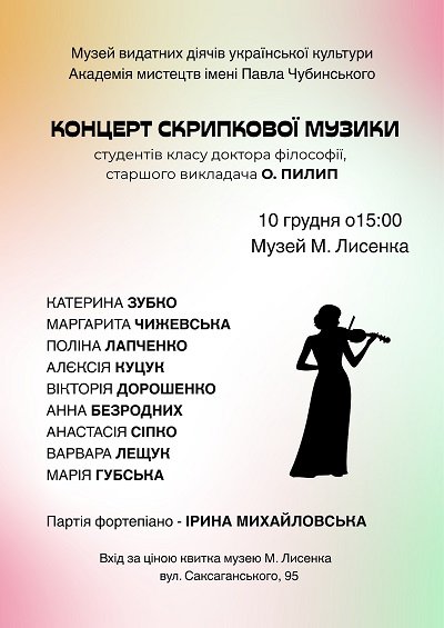 10 грудня 2025 року у затишній атмосфері Музею видатних діячів української культури відбувся концерт скрипкової музики студентів Академії мистецтв імені Павла Чубинського.