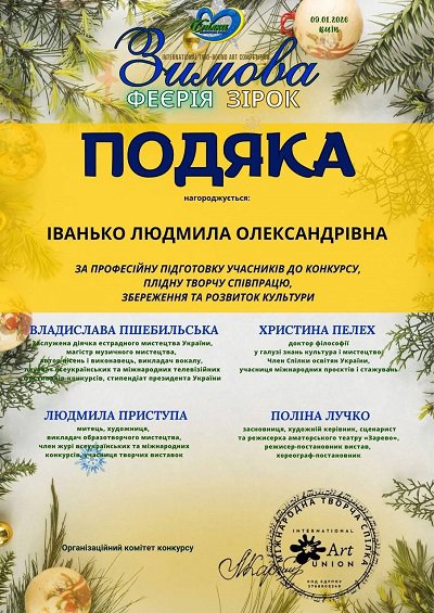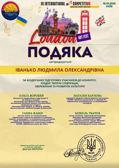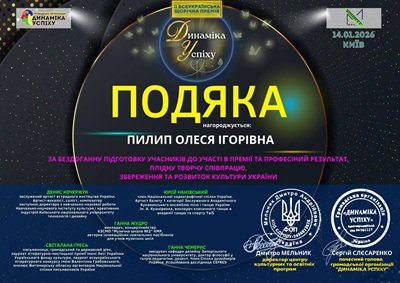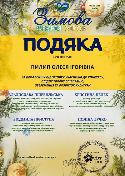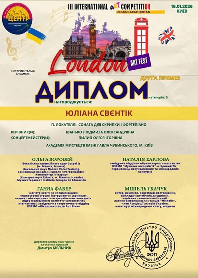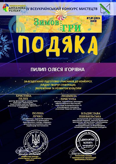 11.12.2021 Вітаємо лауреата 1 премії Петрішина-Канішевського (клас викладача Сухорукової Н.В.), який здобув перемогу у 2-му Всеукраїнському багатожанровому конкурсі-фестивалі м.Черкаси.