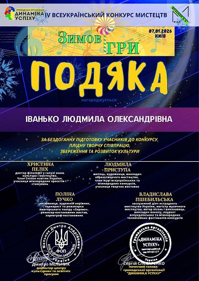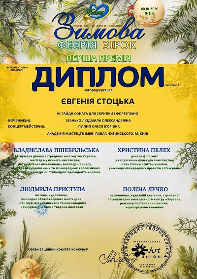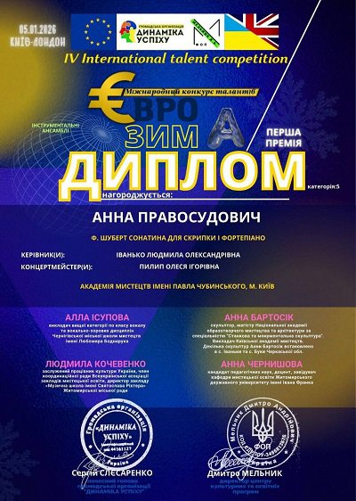 Щиро вітаємо студентку 4 Ф-но ПЦК "Фортепіано і концертмейстерство" Академії мистецтв імені Павла Чубинського Анну Правосудович з перемогою в IV Міжнародному конкурсі талантів "Євро Зима" в номінації "Камерний ансамбль"!(Викладач Людмила Іванько, концертмейстер Олеся Пилип )