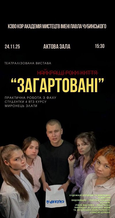 На ці епохальні питання шукали і знаходили відповіді творці театралізованої вистави «Загартовані», що презентована 24 листопада в актовій залі Академії мистецтв імені Павла Чубинського.
