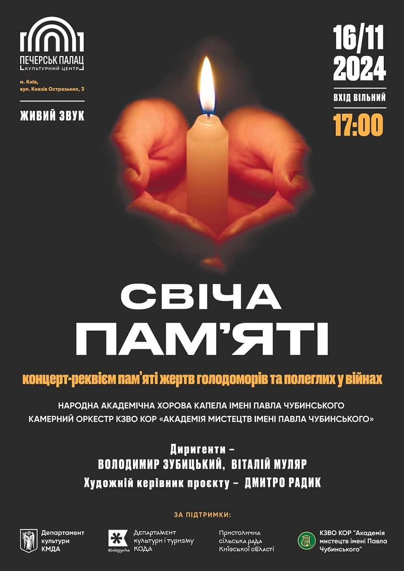 "Свічу пам'яті" найперш озвучує Народна академічна хорова капела імені Павла Чубинського (диригент - Віталій Муляр). Звучать твори- молитви.