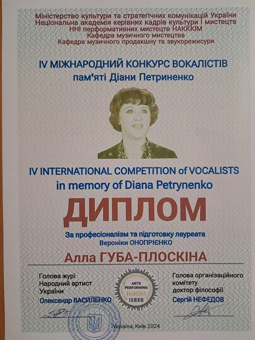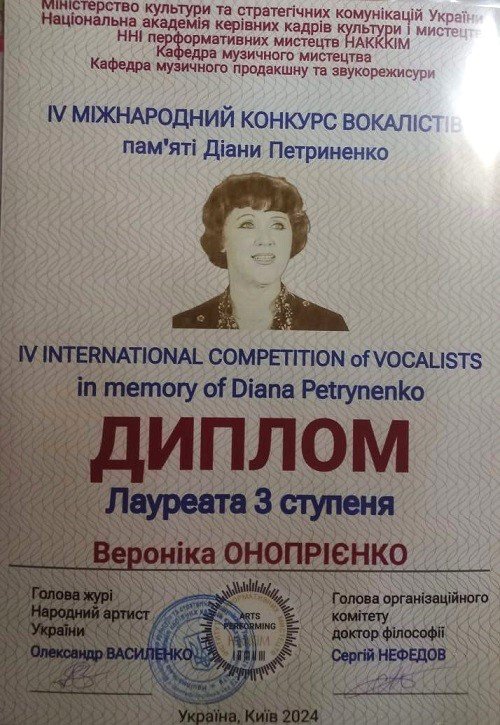 Маємо гарну новину! Студентка 3 БМС курсу Академії мистецтв імені Павла Чубинського Вероніка Онопрієнко здобула третє місце на ІV Міжнародному конкурсі вокалістів пам'яті Діани Петриненко!