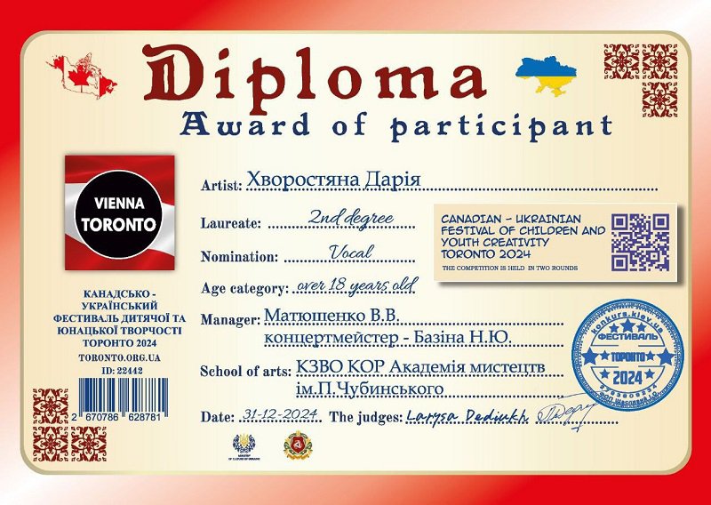 Чудова новина: Дарія Хворостяна успішно виступила на Міжнародному конкурсі-фестивалі «Vienna-Toronto» і стала Лауреаткою ІІ премії. Тож сердечно вітаємо нашу студентку 4 курсу спеціальності «Бакалавр мистецтва співу» Дарію Хворостяну (клас викладачки, заслуженої артистки України Валентини Володимирівни Матюшенко, концертмейстерка – Наталія Юріївна Базіна) з новими творчими досягненнями. Так тримати! Радіємо і бажаємо нових перемог!